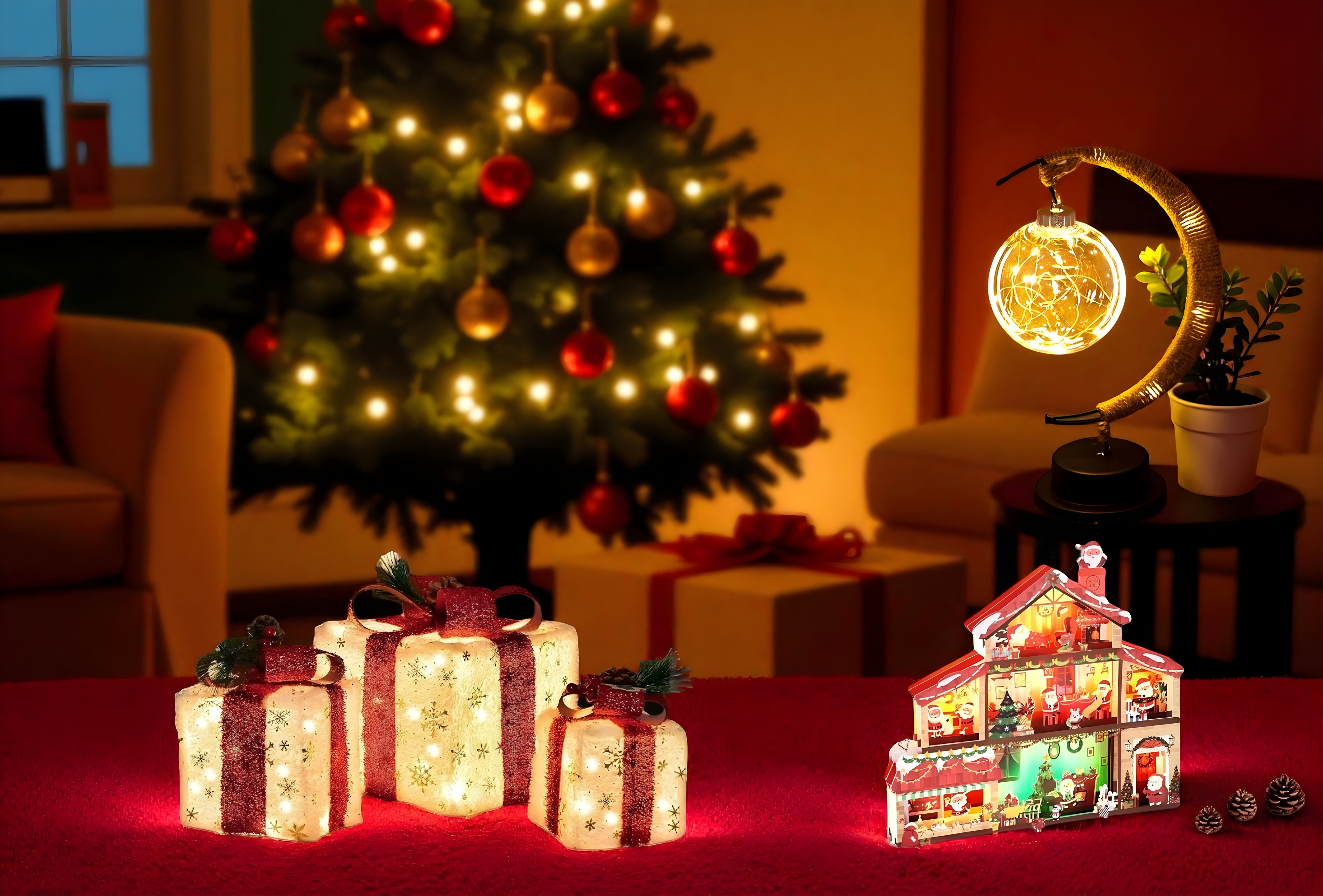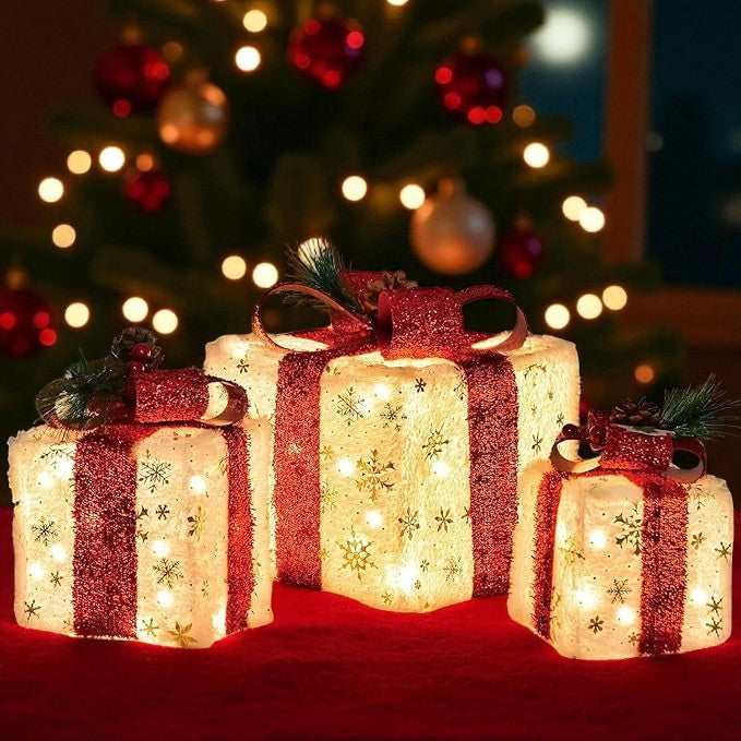 Add a festive sparkle to your home with Glow Fest Boxes, a charming set of 3 illuminated gift boxes. Their warm glow and golden snowflake details create a cozy, magical atmosphere perfect for holiday gatherings, parties, or simply brightening any room. Let these glowing boxes bring joy, warmth, and a touch of Christmas magic to your space.